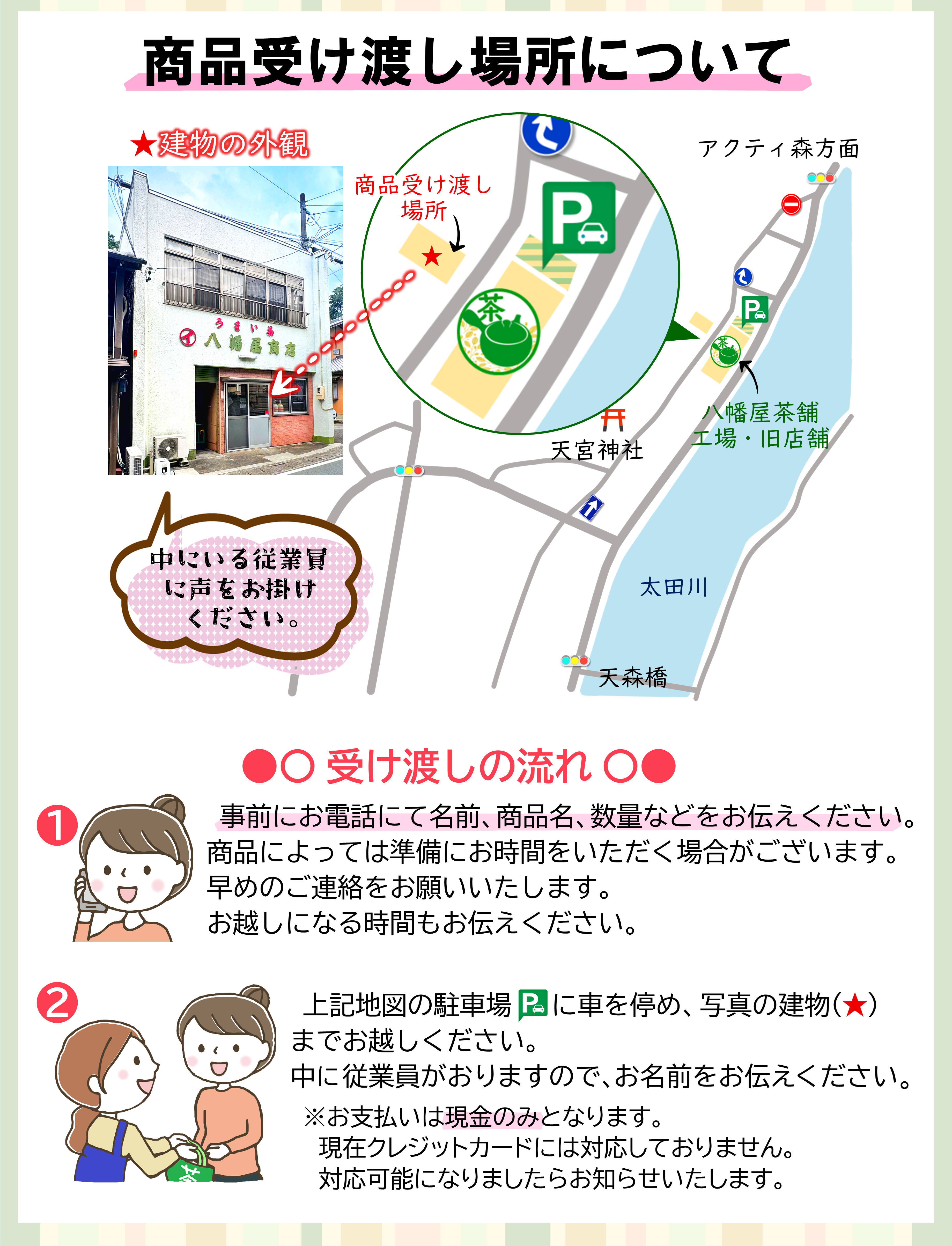 この度、八幡屋茶舗の店舗は事業拡大(工場改装)のため、2025年10月31日(金)をもちまして一時閉店させていただくこととなりました。再開時期・場所は現在未定となっておりますが、決まり次第お知らせいたします。急なお知らせとなり、これまで店舗へご来店いただいていたお客様には大変ご迷惑をおかけ致します。お電話、FAX、郵便、ネットショップ、Eメールからのご注文は今まで通り変更ございません。店舗は一時閉店致しますが、事前にお電話にて商品名や数量をお伝えいただければ、商品の受け渡しは可能です。受け渡し場所詳細はこちら